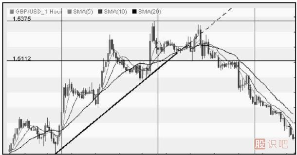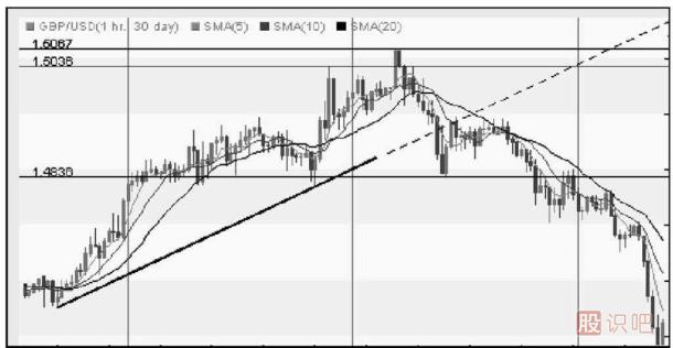 我們注意到,匯價果真下跌,至1.503 6附近,確認了2B法則。但是2B法則引發(fā)的是自1.503 6開始的短期下跌走勢(短期反轉走勢),具體到匯價自上升趨勢線起始水平開始的主要上升趨勢是否反轉,則要進一步分析。