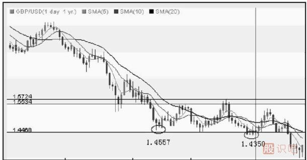 這是我們兩次利用2B法則采取的高賣低買的交易策略,接下來我們?nèi)匀挥欣眠@一法則進行交易的機會。如圖1-2所示,匯價跌至1.435 0低點后,未能進一步下跌,在前低1.446 8振蕩4個交易日后,匯價反轉上升,此時即可逢低買入,緊設止損于1.435 0下方,目標即是前期反彈高點1.572 4。