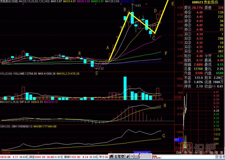 南玻A(000012)2006年的K線圖。2006年年初,大盤開始逐步走好,這時,業(yè)績好的股票都開始了上漲的過程。莊家在前期緩慢拉升股價吸籌,到這時莊家發(fā)現(xiàn)牛市跡象,于是開始通過拉高建倉的方式來完成建倉。在2006年4月5日開始以放量漲停方式收集籌碼,當天換手率放大100%以上,到2006年6月1日,股價上漲超過50%,這段時間的換手率超過100%。對于這種走勢,散戶(特別是被前期被套的散戶)會認為這是莊家推高股價出貨,會趁著股價的上漲拋出手中的籌碼。