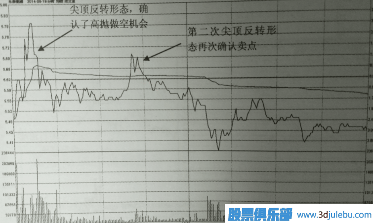 價格在分時圖中確認(rèn)是尖頂?shù)牡湫头崔D(zhuǎn)形態(tài)的時候,是高拋做空的信號。這個時候,如果成交量達(dá)到天量,并且即將成為日K線圖中的典型頂部形態(tài),那么我們在分時圖中做空交易是沒有問題的。隨著天量頂部反轉(zhuǎn)形態(tài)的出現(xiàn),價格下跌空間將非常大,這里高拋的機會成為最佳的做空信號。