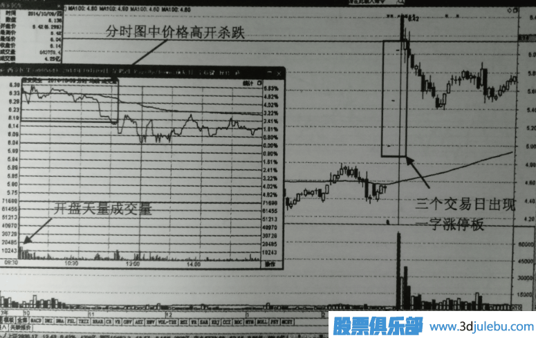 要點2:結(jié)合日K線圖中股價連續(xù)三日出現(xiàn)跳空上漲的一字漲停走勢,我們可以斷定,分時圖中天量高開后回落情況已經(jīng)構(gòu)成反轉(zhuǎn)形態(tài)。即便還未到收盤,我們提前一步做空,都可以降低虧損。
