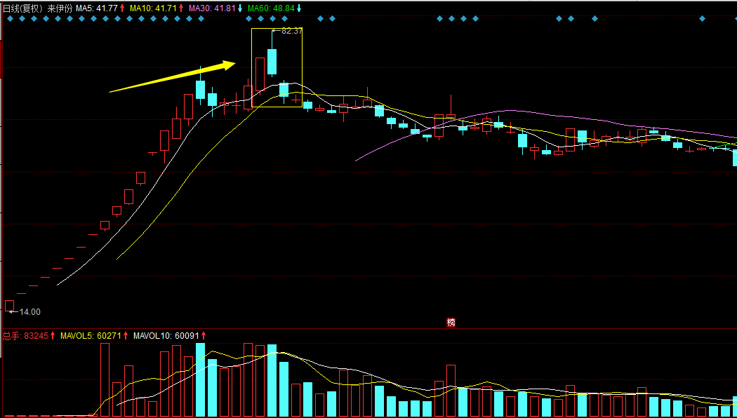 龍頭股短線見頂后,跌破五日線,因為十日線支撐的緣故,通常在5日和10日線之間保持震蕩,也是在等10日線上移。