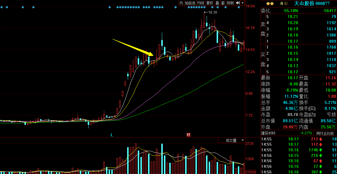 天山股份2017/2/28,天山在高位的時候,呈現(xiàn)震蕩趨勢,但并沒有收出明顯的見頂K線組合,所以在十日線附近的時候,相對其他個股,更強勢一些。