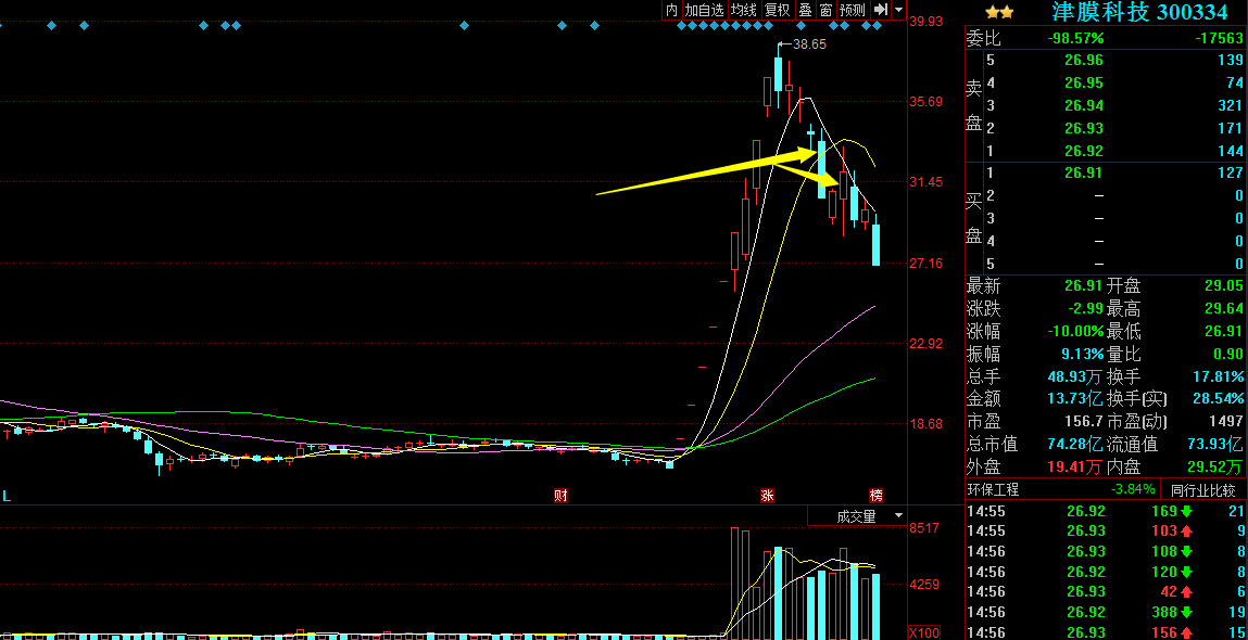 津膜科技2017/5/25,股價一根長陰線跌破10日線支撐位,反彈兩天并沒有突破10日線壓力位,而此時均線系統(tǒng)已經(jīng)死叉,趨勢徹底轉(zhuǎn)空了。