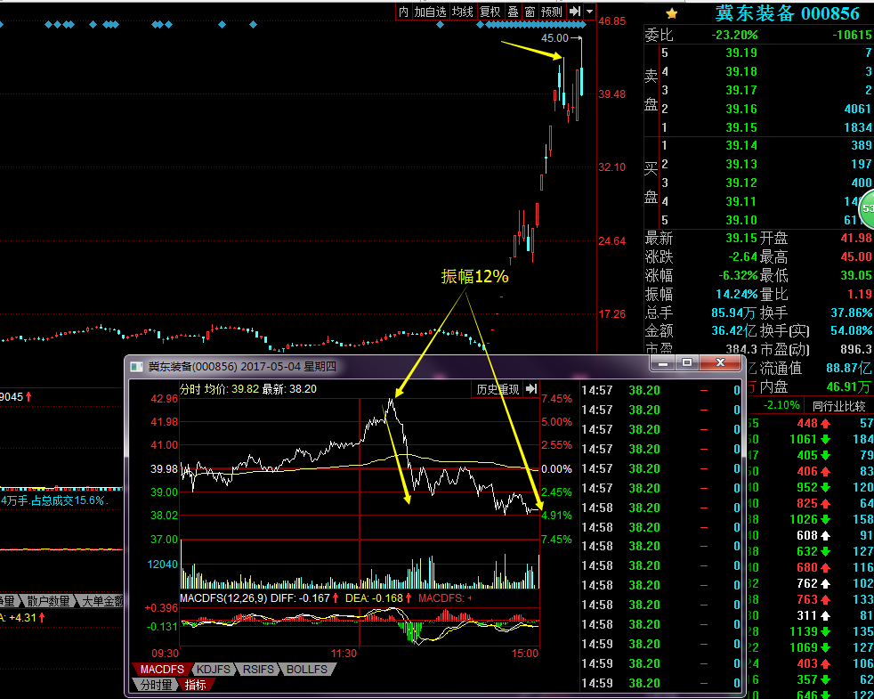 冀東裝備2017/5/24,冀東裝備午后震蕩上升,隨后大幅跳水,全天振幅達12%,這是資金大幅出逃的跡象,結(jié)合上述三條,龍頭個股短線上升末期,出現(xiàn)這樣的形態(tài),大概率見頂了。