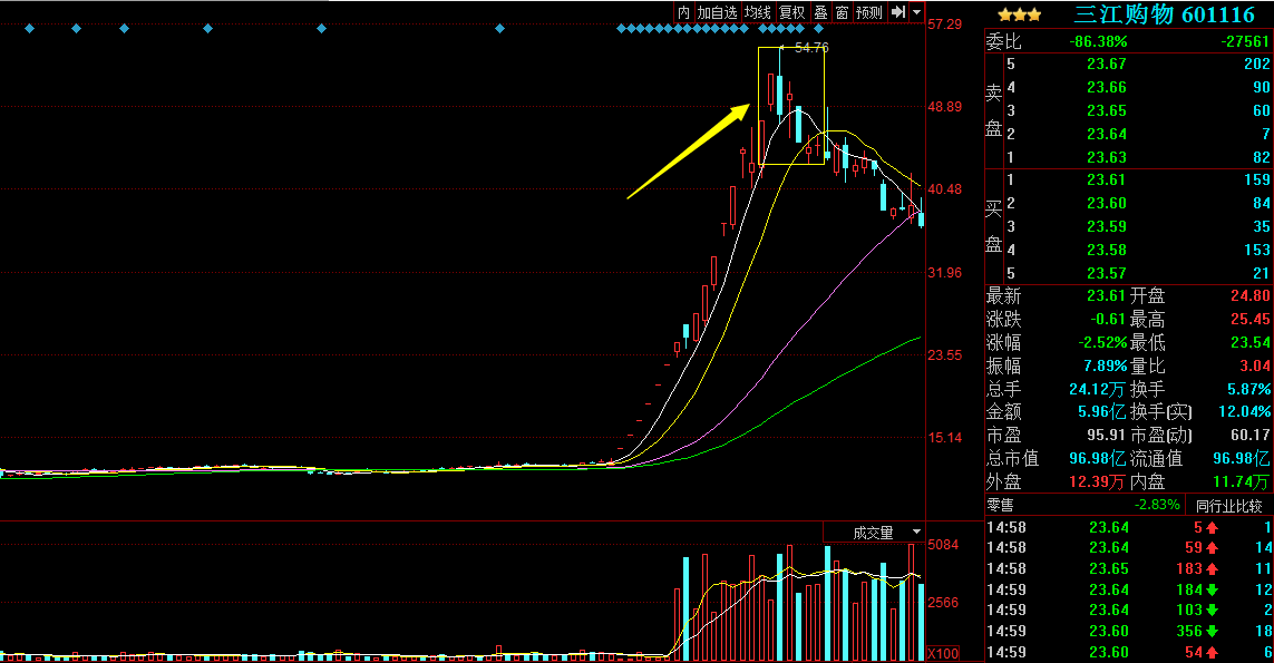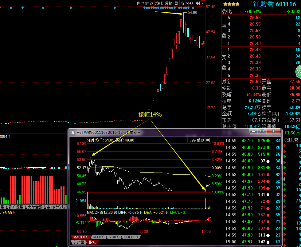 三江購物2016/12/21,20日還是漲停板走勢,21日平盤開盤,表現(xiàn)的很弱勢,隨后并沒有沖高,而是逐級下跌無力反彈,當天也是大幅放量,是20日的倍量了,短線見頂。