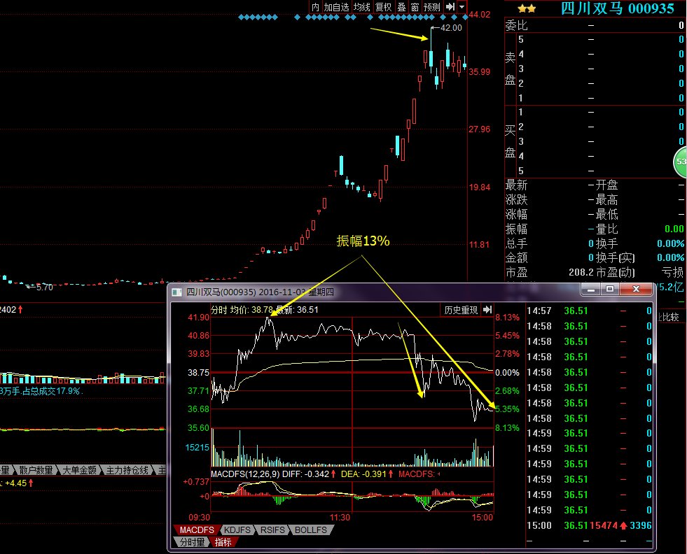 四川雙馬2016/12/5,雖然股價跌破20日線有過兩次反彈,但總體來看,給參與的機會并不多,如果是短線打板選手,可以說并沒有給肉吃的,漲停后的日日也僅僅是有個小高開罷了。