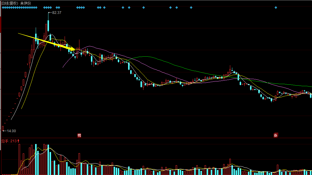 來伊份2016/11/30,在股價跌破20日均線后,雖然有反彈,但趨勢的力量還是難以扭轉(zhuǎn),后期開始了漫長的下跌行情。