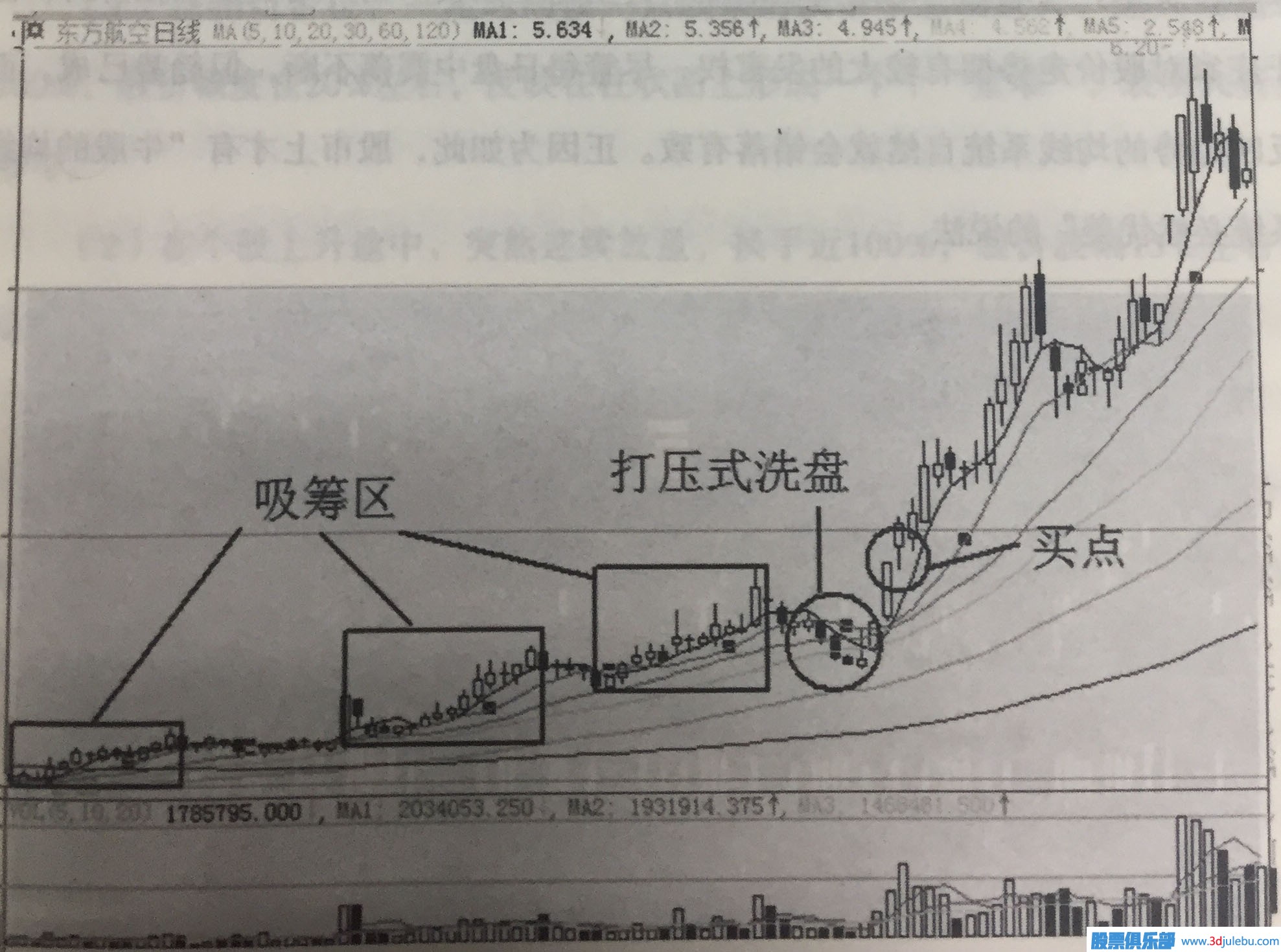 在圖1-3中我們標(biāo)出該形態(tài)下的買點,在此處買入對散戶而言可以實現(xiàn)時間于收益的最優(yōu)。在在短的時間內(nèi)就會有很好的收獲。當(dāng)然在圖中的吸籌區(qū)也可以作為中長線買點。但我們不會建議散戶朋友們在此時介入,在圖中大家也能看到答案。吸籌的過程必然伴隨洗盤的存在。 洗盤雖方式可以不同但伴隨在整個吸籌過程中。在以后的章節(jié)我 我們會詳解洗盤的方式。