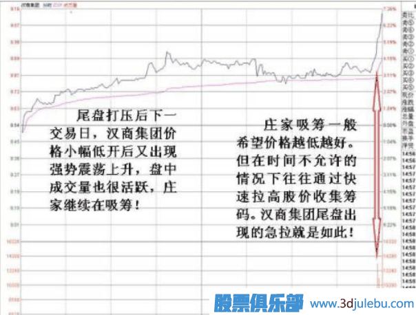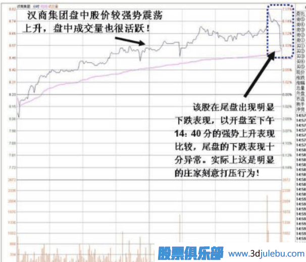 莊家打壓吸籌行為動作中,有一種是利用 尾盤最后幾分鐘快速將 股價打低 。一般用幾筆大賣單將股價打低 2%—3% 左右。建倉時莊家 尾盤 打低 股價 目的是, 為了在次日吸籌有更便宜的價格,以降低籌碼平均成本。 股價被砸低后使得當(dāng)日該股日 K 線影有較長上影線或十字星,制造難看的圖表。這起到振倉和減少技術(shù)派大量跟進(jìn)作用。