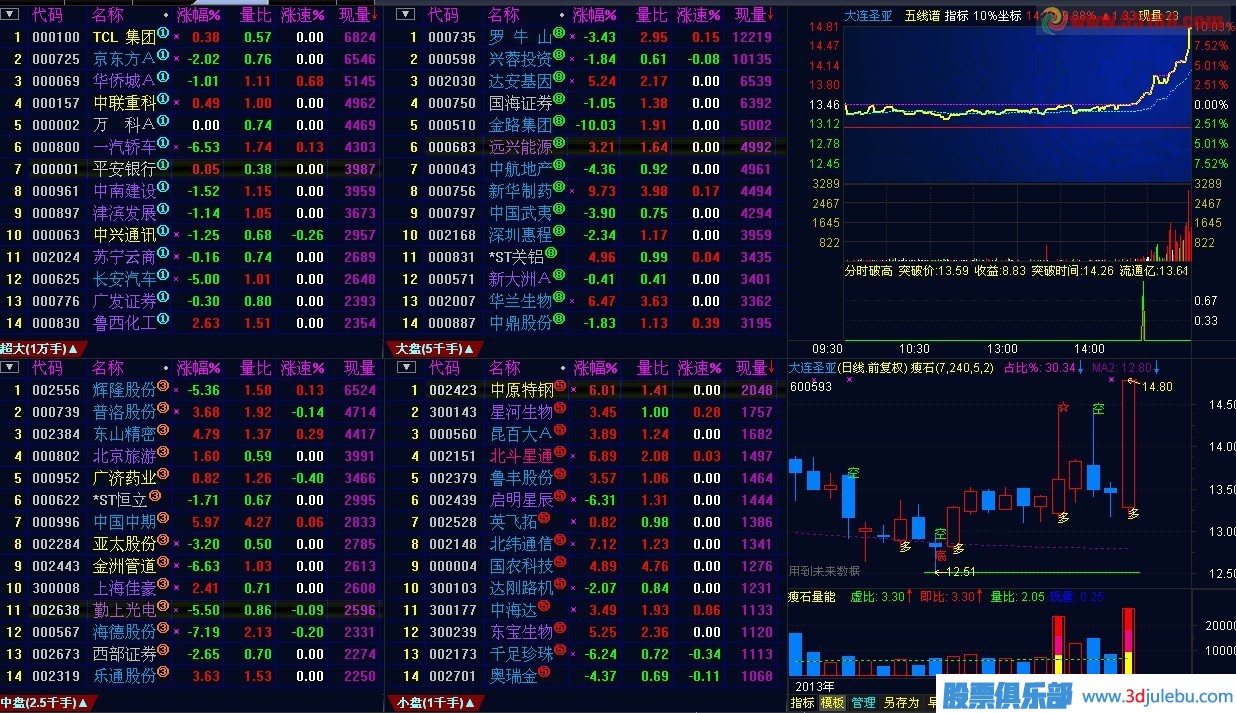 3 依據(jù)流通股本的股票看盤軟件提醒您通達(dá)信軟件通過(guò)現(xiàn)量尋找異動(dòng)個(gè)股大小,將整個(gè)市場(chǎng)分為四大版塊 (超大盤/大盤/中盤/小盤)
