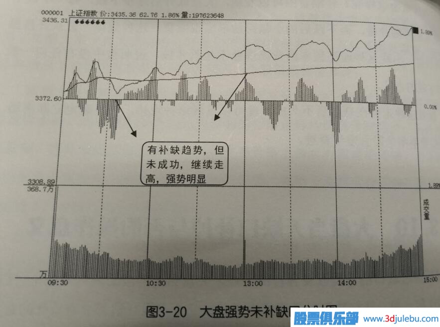 如圖3-20所示是大盤(pán)某天的分時(shí)走勢(shì)圖, 圖中顯示當(dāng)天指數(shù)出現(xiàn)高開(kāi),在 十點(diǎn)過(guò)有明顯的一波回補(bǔ)缺口趨勢(shì), 但最終并沒(méi)有補(bǔ)缺成功,指數(shù)再次上均線, 隨后便單邊上揚(yáng)走高根率較大, 正因?yàn)榭颇軟](méi)有成功說(shuō)明當(dāng)天大盤(pán)走勢(shì)強(qiáng)勢(shì),指數(shù)當(dāng)天維續(xù) 因此當(dāng)數(shù)科次上均線時(shí)就是入場(chǎng)時(shí)機(jī),短線獲利根率非常大,
