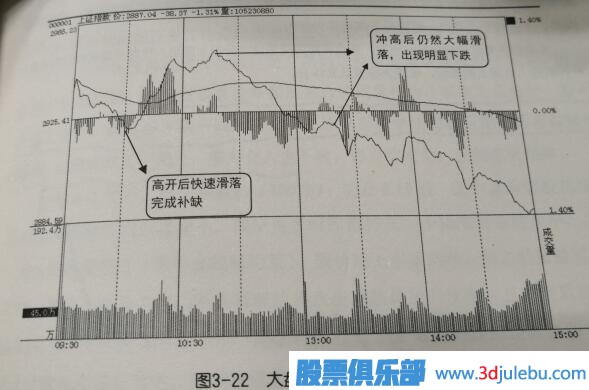 如圖3-22所示,大盤(pán)高開(kāi)回落回補(bǔ)缺口,盡管補(bǔ)缺后出現(xiàn)-波拉升,但最終仍然下跌。