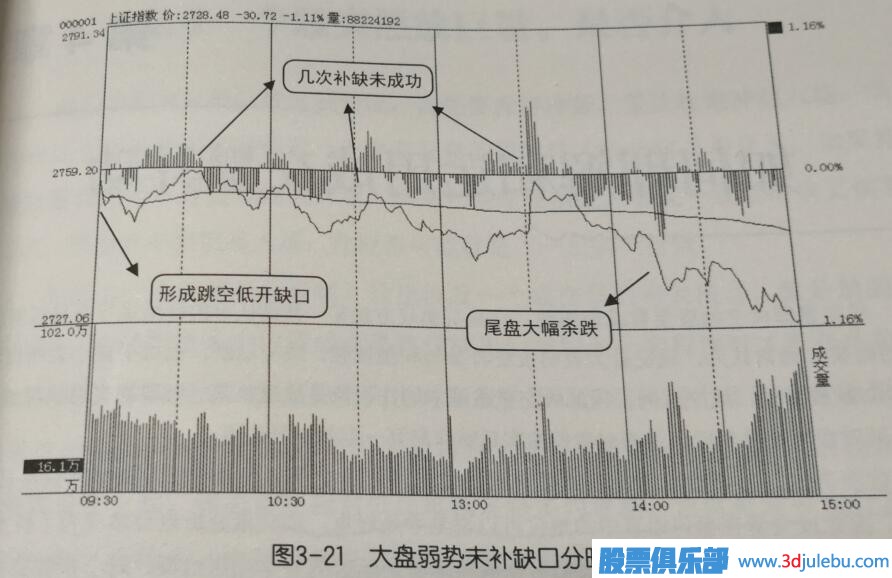 如圖3-21所示是大盤(pán)某天的分時(shí)走勢(shì)圖,圖中顯示當(dāng)天大盤(pán)低開(kāi)后盤(pán)中有多次回補(bǔ)跳空缺口動(dòng)作, 但最終都
