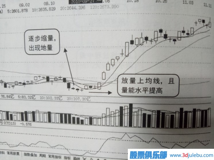 那如何能做到提前潛伏呢?首先我們要對(duì)大盤(pán)進(jìn)行認(rèn)真分析,如圖1所示是大盤(pán)的日K圖,從圖中我們可以看到大盤(pán)經(jīng)過(guò)了較長(zhǎng)時(shí)間橫盤(pán),且量?jī)r(jià)呈現(xiàn)較好配合,在9月27日前幾天出現(xiàn)破位,但量能迅速萎縮,并出現(xiàn)階段地量,地量往往預(yù)示著變盤(pán),且長(zhǎng)期橫盤(pán)后本來(lái)大盤(pán)就面臨方向性選擇,因此此時(shí)就應(yīng)該開(kāi)始密切關(guān)注盤(pán)面的變化。