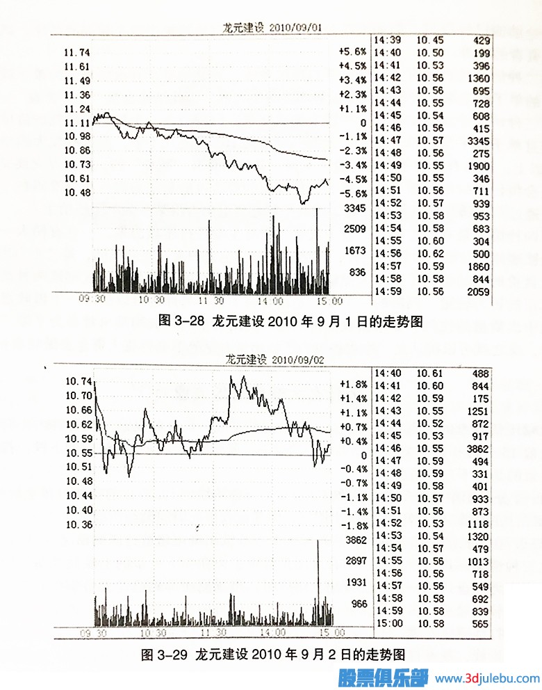 如果此時30日均線為明顯的上行趨勢,股價漲幅并不是很大,就更可能是主力在打壓。如2010年9月1日的龍元建設,尾盤主力放量打壓,但根據(jù)當日超贏數(shù)據(jù)顯示,超大戶增倉368萬,大戶減倉374萬,屬于明顯的對倒洗盤行為,9月2日該股以漲停報收(如圖3-28,圖3-29所示)。