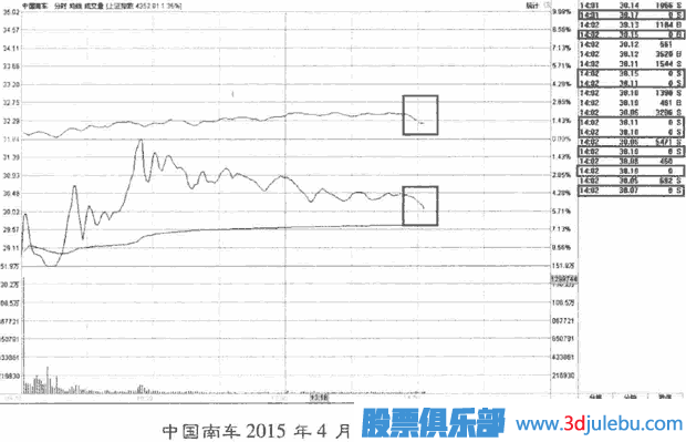 撤單是常見的盤口現(xiàn)象,每只股票幾乎每天都會(huì)發(fā)生,有的是散戶自發(fā)的撤單,是正常交易;有的是主力刻意撤單,是虛假申報(bào)。下圖為中國南車的個(gè)股分時(shí)圖,2015年4月22日14:02時(shí),因大盤趨勢向下調(diào)整,中國南車大量賣單撤銷。