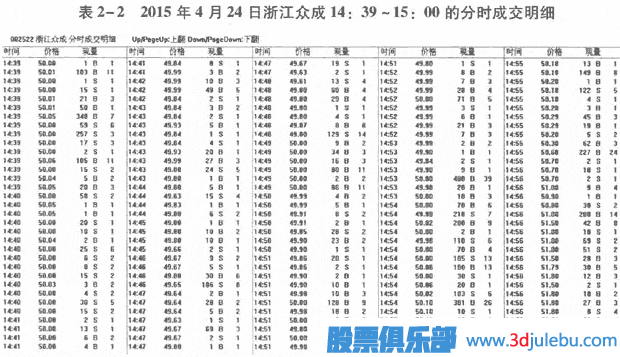 當(dāng)然,在大勢向好時(shí),大賣單往往也會(huì)出現(xiàn)在委托盤口,為的就是吸引大買家吃進(jìn),此時(shí)大賣家不顯身,大買家通常也無法顯身;而在下跌趨勢中,看好該股的大買單也往往會(huì)出現(xiàn)在委托盤口,為的就是等待大賣家顯身。表2-2為2015年4月24日浙江眾成14:39-15:00的分時(shí)成交明細(xì),明細(xì)表顯示并無大單。