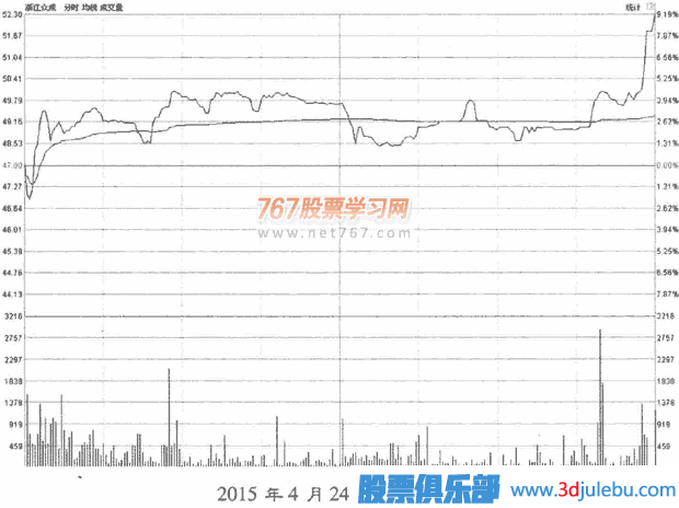 但是2015年4月24日浙江眾成的個(gè)股分時(shí)圖卻顯示,尾盤在急劇拉升(下圖),短短的9分鐘,由49.81元拉升至52.30元,幅度高達(dá)近5%,顯然是莊家通過隱性買賣盤在進(jìn)行拉升。莊家將大單化整為零,隱藏在無數(shù)個(gè)小單中。