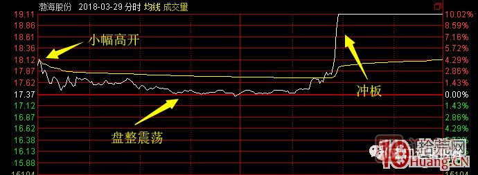 條件:競價小幅高開或平開(低于3%),開盤迅速沖高(5-10分鐘內(nèi)股價突破7%),10:00前上板最佳,最好不要晚于10:30。這種分時圖整體是震蕩攀升格局。