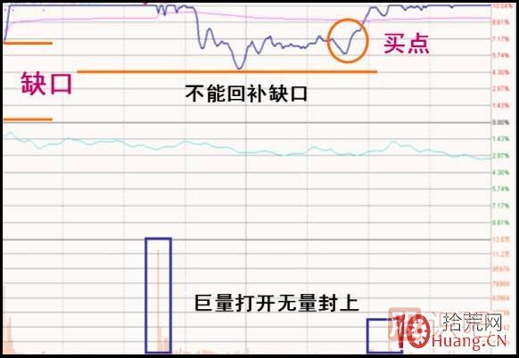 根據(jù)前文的提示,我們可以得出該股的盤口特征明顯屬于后者——在打開漲停板后最低回探到4.5%的低點(diǎn)之后就不再下跌了。這種回探已經(jīng)部分回補(bǔ)了缺口,但是也僅僅就回補(bǔ)到了這里為止。