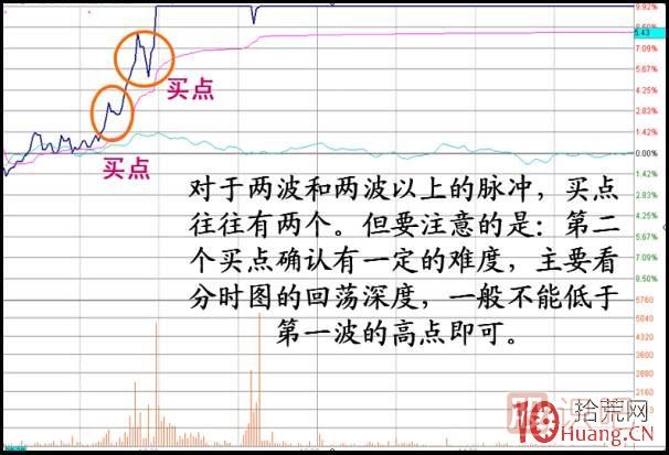 不過事物都是兩面性的,雖然該股多出了一個(gè)買點(diǎn),但是其“確認(rèn)”漲停的難度也加大了。這里有一個(gè)最低標(biāo)準(zhǔn),就是第二波的脈沖回蕩的低點(diǎn)不能低于第一波脈沖的高點(diǎn) ,第三波脈沖不能低于第二波脈沖的高點(diǎn),否則這種脈沖就是無效的,后面很可能演化成沖高回落的走勢,請切記!