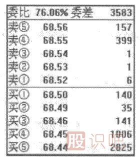 從圖中看出:主力在68.50元掛出140手買單后(其實(shí)不止這么點(diǎn),前面已經(jīng)成交了幾百手)。然后在68.45元和68.44元分別掛出兩個(gè)四位數(shù)大買單,中間“跳躍”了68.49、68.48、68.47、68.46四個(gè)價(jià)位(注意,68.49的35手買單和68.46元的141手買單是散戶的掛單,不是主力的掛單),其中68.48和68.47兩個(gè)價(jià)位無任何掛單,就是說連散戶的掛單也沒有。這是因?yàn)橹髁Ω鶕?jù)市場(chǎng)喜歡在整數(shù)位掛單的習(xí)慣,故意在非整數(shù)處68.44元掛出2825手買單,以起到接盤的烘托作用。