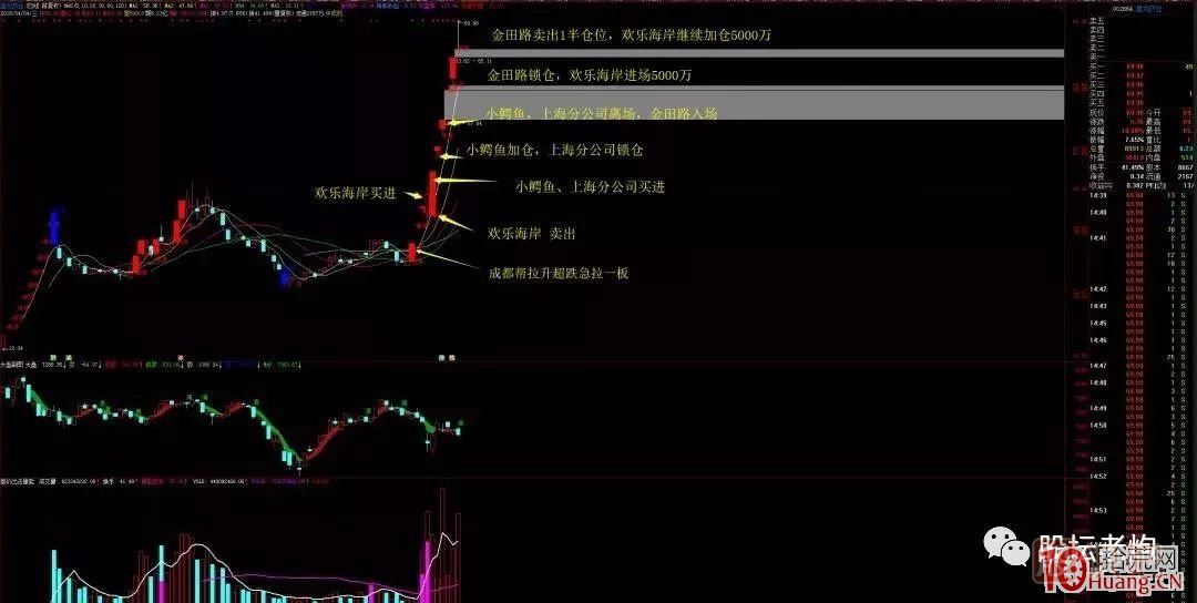 成都幫拉升超跌急拉一板,然后連續(xù)秒板,沖擊四板引來歡樂海岸入場,然后炸板,第二天深圳歡樂海岸割肉,隨后午后拉板龍頭強(qiáng)勢反包,小鱷魚和上海分公司入場,第二天快速急拉秒板,小鱷魚加倉,中信上海分公司鎖倉,三板爛板,小鱷魚,上海分公司離場,金田深南哥入場,之后一字四連板,5連板金田鎖倉,歡樂海岸進(jìn)場,6連板歡樂海岸加倉,金田減倉,隨后7連板出貨,總體所有游資都在這只票上吃到了大肉。