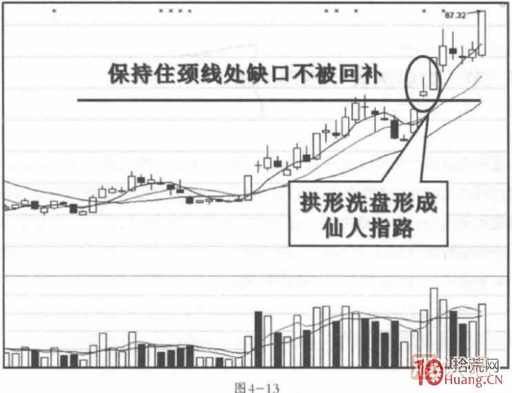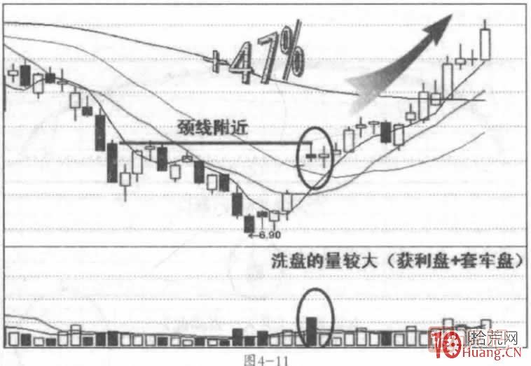 圖4-11告訴我們,主力經(jīng)過兩天的拱形洗盤之后,股價便突破了頸線,開始了一波中級行情,白本圖截圖時已經(jīng)上漲47%!