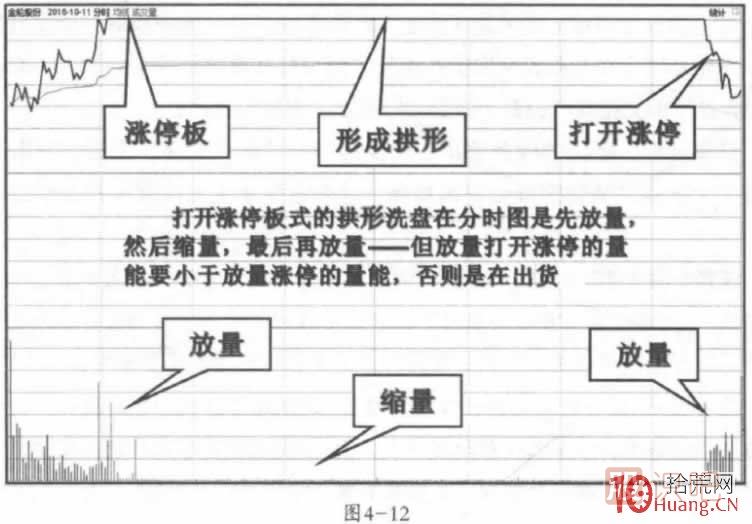 還有一種極強(qiáng)式的拱形洗盤,就是攻上漲停板后再打開,然后再封上,請看圖4-12.