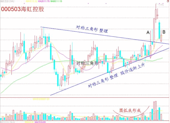 這訣是說(shuō)股票的長(zhǎng)時(shí)間盤(pán)整形態(tài)和未來(lái)變盤(pán)方向的。當(dāng)一只股票中線或者長(zhǎng)線盤(pán)整時(shí),其K線圖多會(huì)走出一個(gè)較大 的三角形,再接一個(gè)較小的三角形,有的長(zhǎng)線股可能走出大、中、小三個(gè)甚至是多個(gè)逐漸趨小的三角形,當(dāng)擠到最頂尖時(shí),就會(huì)變盤(pán)。如果先向上突破不成,就成了 假突破,必會(huì)引發(fā)一輪大砸盤(pán);而如果尖端再次向下破位,一般會(huì)用多根連續(xù)的陰線向下挖出一個(gè)坑,而后則會(huì)一路上揚(yáng)。操作中,要注意假突破的判斷,以防追高 被套,而連續(xù)陰線挖坑則是長(zhǎng)線介入的最佳時(shí)機(jī),其后的漲幅一般會(huì)突破長(zhǎng)期整理的平臺(tái),不可賣出過(guò)早。