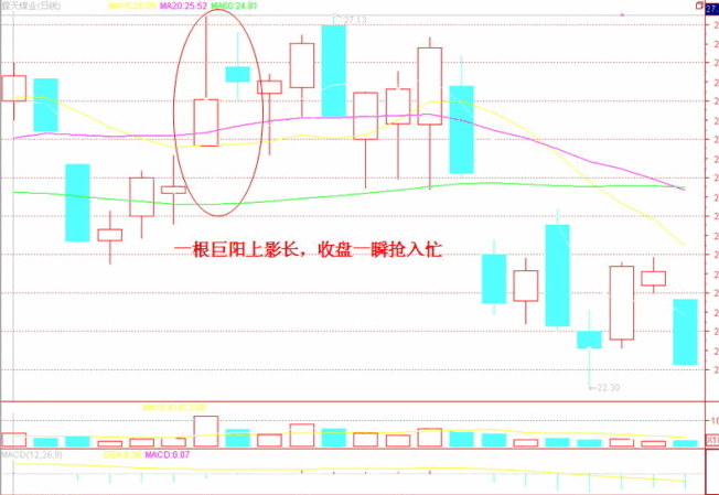 口訣十六:一根巨陽(yáng)上影長(zhǎng),收盤(pán)一瞬搶入忙。