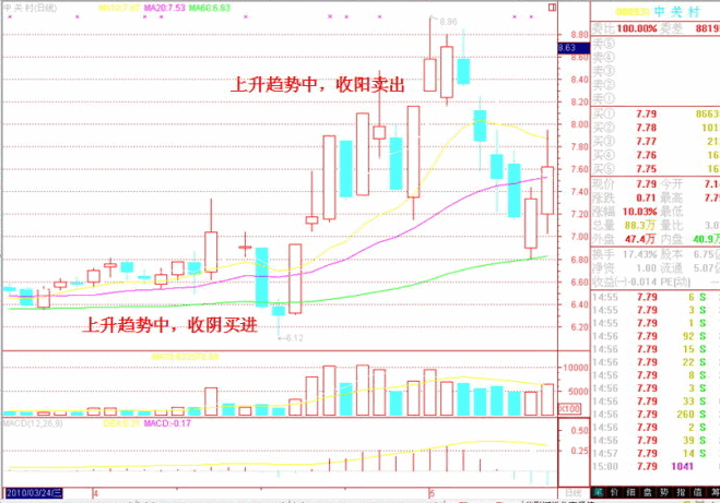 這一口訣與第一訣有點(diǎn)類似,就是講逆市而動(dòng)的道理,第一訣是說(shuō)短線的,第二訣是說(shuō)中線的。即,買(mǎi)時(shí),選則K線收陰線時(shí)買(mǎi);賣時(shí),選則K線收陽(yáng)線時(shí)賣。