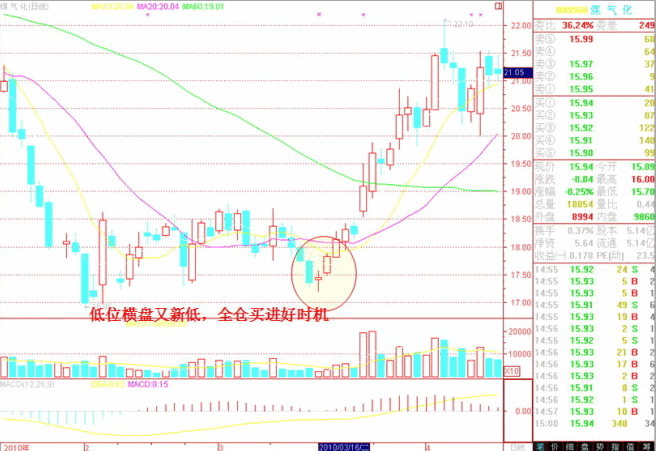 這一口訣是對(duì)口訣三的進(jìn)一步具體化說(shuō)明,是描述訣三中的一種最佳時(shí)機(jī)。股價(jià)和大盤(pán)常常是高位盤(pán)整后還有新 高,低位盤(pán)整后又創(chuàng)新低,因此說(shuō),要等待變盤(pán)的方向明朗后再開(kāi)始。如高位橫盤(pán)后向上變盤(pán),再創(chuàng)新高,這是賣出的最佳時(shí)機(jī);而低位橫盤(pán)整理之后再向下變盤(pán), 這將是滿倉(cāng)買(mǎi)入的最佳時(shí)機(jī)。