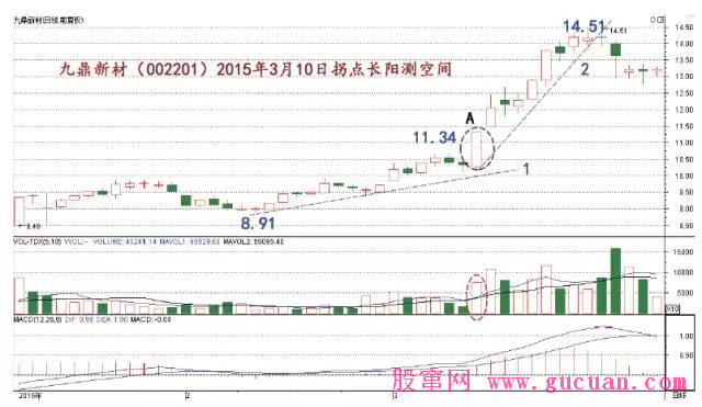 圖2 中,九鼎新材(002201)日線走勢,在2015 年3 月10 日走出顯著放量漲停長陽線(A 處)。此時,我們即可認定該線體,就是上升趨勢的加速拐點。然后積極買進,止損位就設在長陽線的實體下沿,即開盤價位置。隨后,進行波段上漲幅度預估。波段行情的低點8.91 元,拐點長陽線的收盤價11.34 元,然后帶入公式M=C2/L 中,即可得到測算結果: