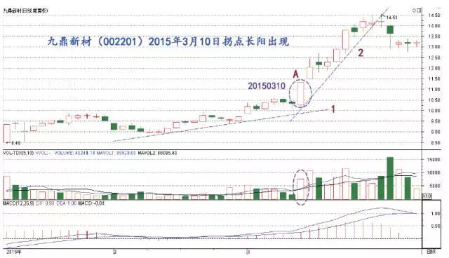 如圖1,九鼎新材(002201)日線走勢圖顯示,股價見波段低點后,沿趨勢線1 逐漸上漲,從A 處帶大量漲停長陽線起,上漲斜率加大(見趨勢線2)。A 處長陽線就是上漲力度發(fā)生改變的加速拐點長陽線,下面簡稱為“拐點長陽線”。統(tǒng)計發(fā)現(xiàn),A 處走出長陽線之前的15 個交易日,股價上漲幅度不到20%,但是,拐點長陽線之后的8 個交易日,股價漲幅達到25%。前后上漲力度比值接近1:3。