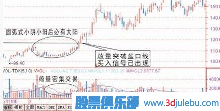 圓弧形態(tài)一般出現(xiàn)在調(diào)整后或者橫盤(pán)整理挖坑后走出的圖形,從技術(shù)形態(tài)上看有二個(gè)特別現(xiàn)象是,一個(gè)是在圓弧底位會(huì)出現(xiàn)密集交易區(qū),(密集交易就是說(shuō)持續(xù)幾天的K線長(zhǎng)短差不多),二是均量萎縮,但是陽(yáng)線是有帶量的,陰線非常縮量。但在圓弧快形成階段量能會(huì)逐步放大,這個(gè)階段為初步買(mǎi)入信號(hào)出現(xiàn),一旦放量突破前弧口處為黃金介入點(diǎn),如果你錯(cuò)過(guò)這一點(diǎn)位,那么一般突破后都會(huì)有一個(gè)回落過(guò)程,當(dāng)然回落不破支撐線可再一次介入信號(hào)出現(xiàn)。如果這一次買(mǎi)入信號(hào)錯(cuò)過(guò)你必將后悔,因?yàn)楹竺嫔儆袡C(jī)會(huì)介入了,不管后市怎么調(diào)整也難回到前面這個(gè)價(jià)位。一般出現(xiàn)類似圓弧圖形的,在后期都會(huì)走一大波行情出來(lái),圓弧越大,主力吸籌越多,后市走向越高。