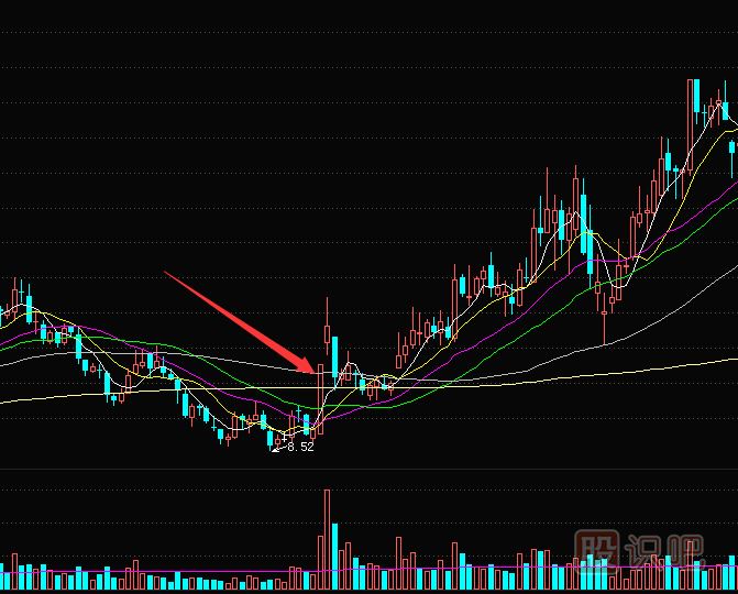圖8-9 一陽穿多線漲停大家知道,均線不但代表著趨勢的方向,也代表著市場的成本。當(dāng)一根均線上破多條均線的時候,該股的成本就與上穿的這些均線對應(yīng)的時間股票的成本接近了。