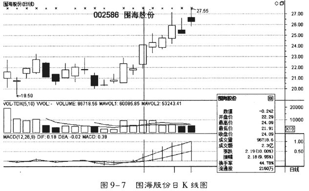一旦投資者發(fā)現(xiàn)新股形呈現(xiàn)首次漲停的走勢,就可以在漲停的時候進行追漲操作,或者在第二天積極建倉。這里重點突出的是,新上市的股票漲停走勢越是堅決,那么后期上漲行情的延續(xù)性也就越好。例如,圍海股份收出上市以來的首個漲停,如果此時果斷介入,之后短短5個交易日,每股可獲得3元的利潤,如圖9-7所示。