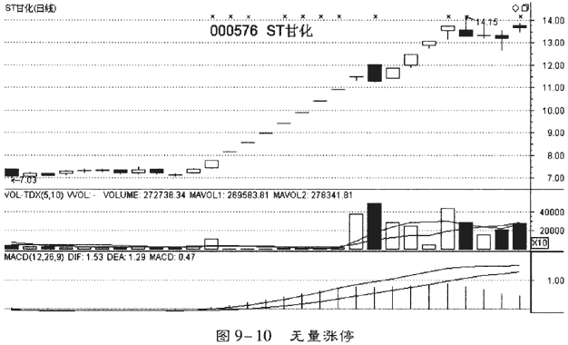 這是一種在多頭力量占據(jù)絕對優(yōu)勢下的特殊表現(xiàn),并非是上漲無量,而是多頭已經(jīng)找不到對手,已經(jīng)沒有空頭再賣出,或賣出的量實在太少的特殊情況。如圖9-10所示。