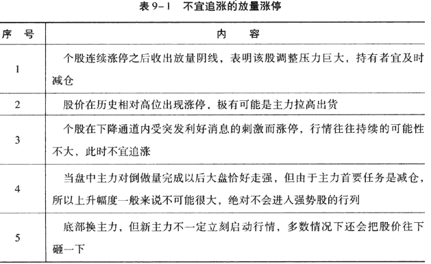 此外,除了上面談到的放量漲停投資時機的把握,這里還有幾種不宜追漲的情況,則應警惕,如表9-1所示。