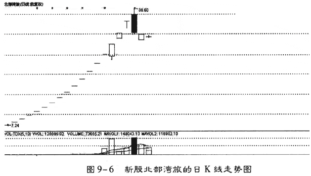 對于普通個股而言股價的漲停是很正常的,但是對于新股而言其第一個漲停板就是最好的操作時機。無論股價后期是否可以再度漲停,至少明天會出現(xiàn)慣性高開,圖9-6所示為2105年3月26日上市的北部灣旅游,盡管上市后連拉了13個漲停,但打開漲停后,走勢依然強勁,只要搶進就能賺錢。