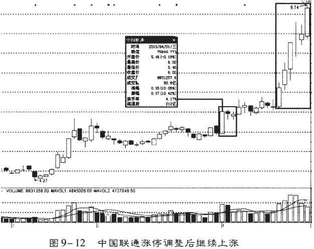 例如,中國聯(lián)通2015年4月1日出現(xiàn)漲停后股價進入短暫的調(diào)整期,經(jīng)過約兩周的調(diào)整后股價一路飆升,如圖9-12所示。