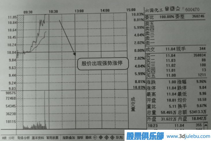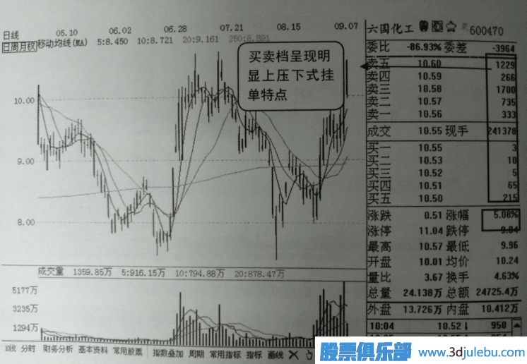 如圖3所示是六國化工的K線界面,圖中顯示該股當天當時已經(jīng)上漲5個百分點,且外盤比內(nèi)盤大得較多,已知當天農(nóng)藥化肥板塊領(lǐng)漲,另外可觀察到當時的買賣檔已經(jīng)出現(xiàn)非常明顯的上壓下式非對稱蜂窩掛單,說明該股當天法停概率很大,操作上可適當追入。
