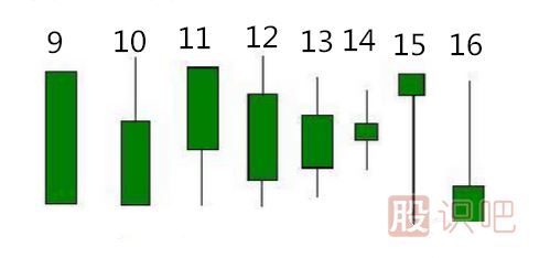 14、星形陰線,也稱極陰線,實體很小,上下影線也較短,走勢不確定,漲跌難判斷。