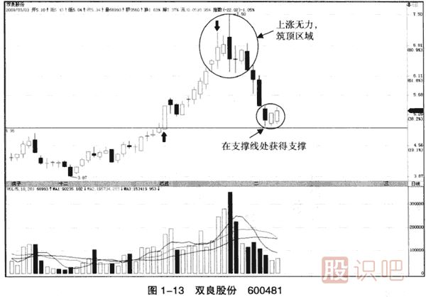 (4)股價(jià)在下跌到支撐線處得到有力的支撐。