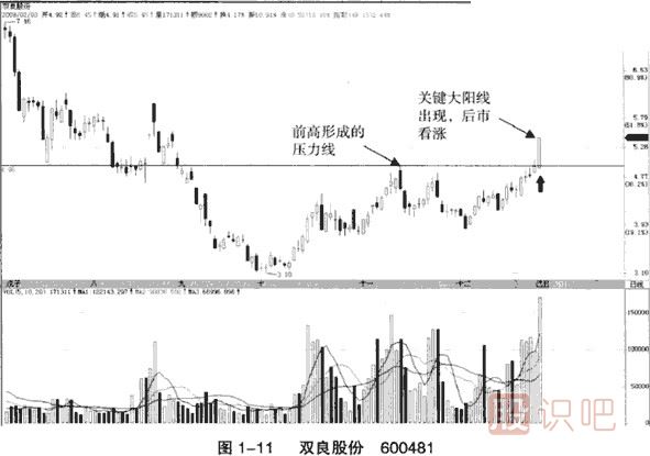(4)大陽(yáng)線突破調(diào)整壓力線,成交量之放大。