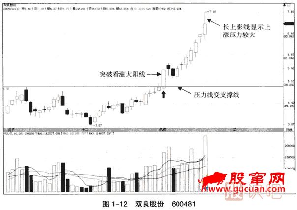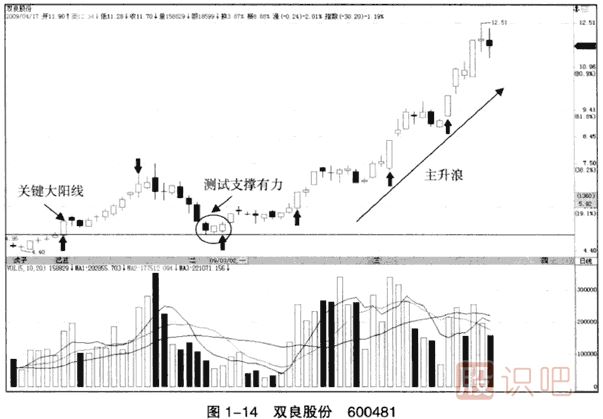 (1)圖1-14顯示了雙良股份突破重要壓力線后的真正拉升過(guò)程。