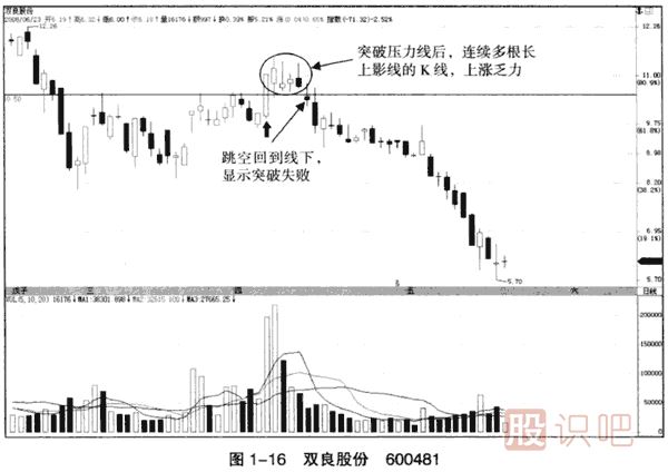 (1)圖1一16顯示了那根大陽(yáng)線(見(jiàn)圖中箭頭所指)出現(xiàn)之后的走勢(shì),股價(jià)迅速腰斬