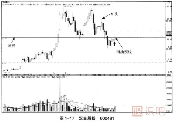 (3)2008年5月9日,大長(zhǎng)陽(yáng)突破頸線(圖中實(shí)線),只是對(duì)頸線進(jìn)行回抽,屬于賣(mài)出信號(hào)。